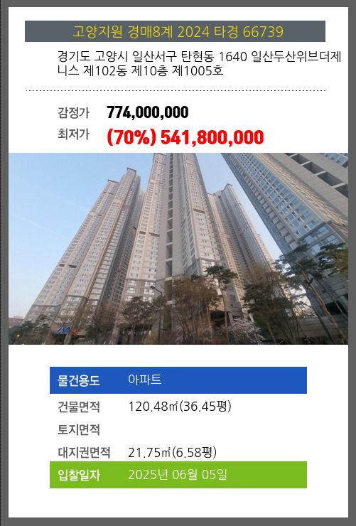 본건은 경기도 고양시 일산서구 탄현동 1640 일산두산위브더제니스 제102동 제10층 제1005호
