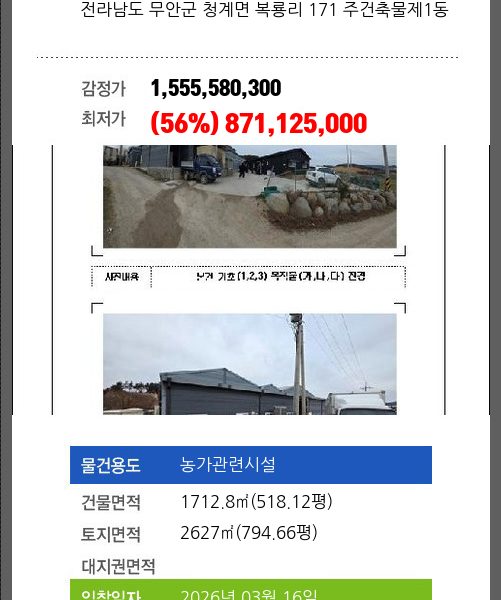 | 토지면적 | 2844.1㎡ (860.34평) | 소유자 | ㈜** | 보증금 | (10%) 108,915,130 |
