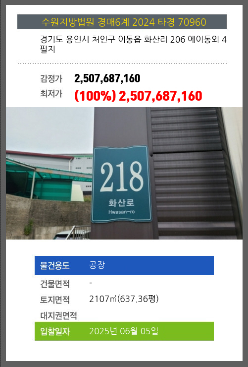 | 용도 | 공장 | 채권자 | ** | 감정가 | 2,507,687,160 |