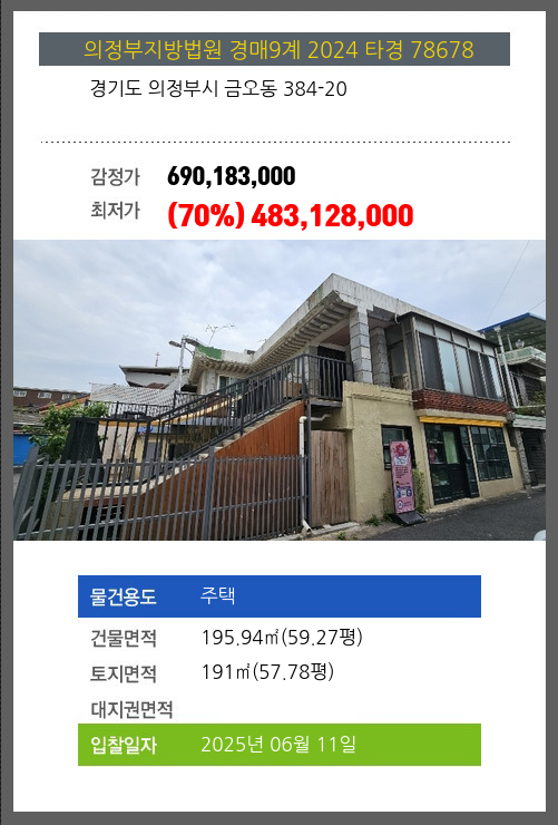 | 건물면적 | 195.94㎡ (59.27평) | 채무자 | 임** | 최저가 | (70%) 483,128,000 |