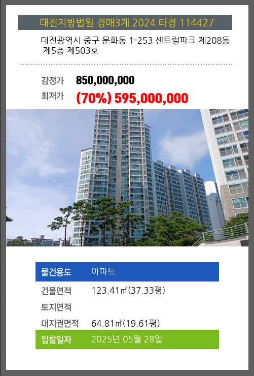 본건은 대전광역시 중구 문화동 1-253 센트럴파크 제208동 제5층 제503호