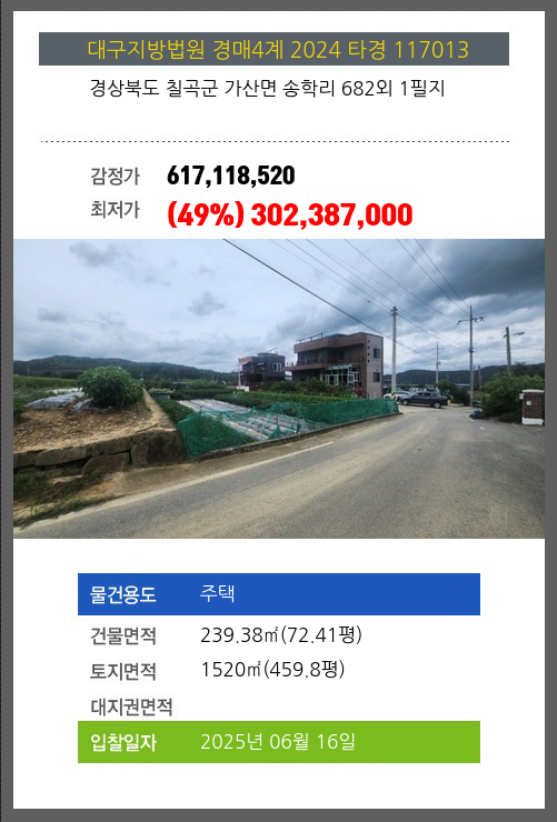 칠곡주택경매 칠곡군 가산면 송학리 682외 1필지 №2024 타경 117013
