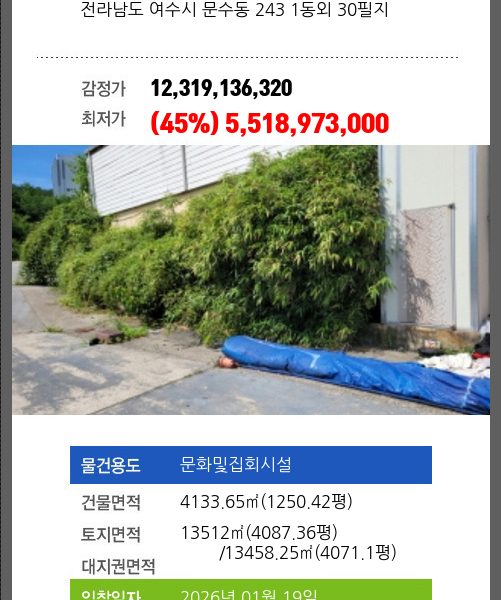 | 토지면적 | 1464㎡ (442.86평) | 소유자 | 민** | 보증금 | (10%) 39,446,700 |