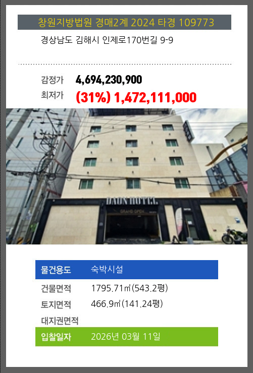 | 용도 | 숙박시설 | 채권자 | 대** | 감정가 | 4,694,230,900 |