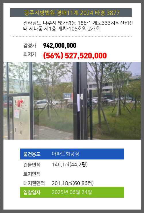 본건은 전라남도 나주시 빛가람동 186-1 게토333지식산업센터 제나동 제1층 제씨-105호외 2개호