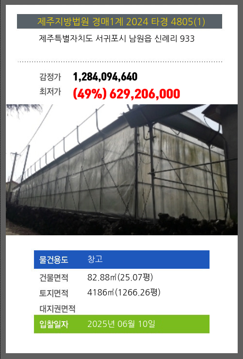 | 토지면적 | 4186㎡ (1266.26평) | 소유자 | 고** | 보증금 | (10%) 62,920,600 |