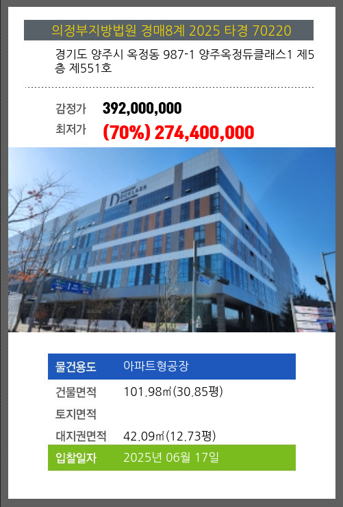 양주아파트형공장경매 양주시 옥정동 987-1 양주옥정듀클래스1 제5층 제551호 №2025 타경 70220