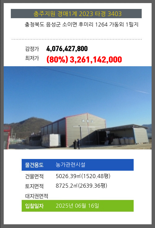 | 건물면적 | 5026.39㎡ (1520.48평) | 채무자 | 농** | 최저가 | (80%) 3,261,142,000 |