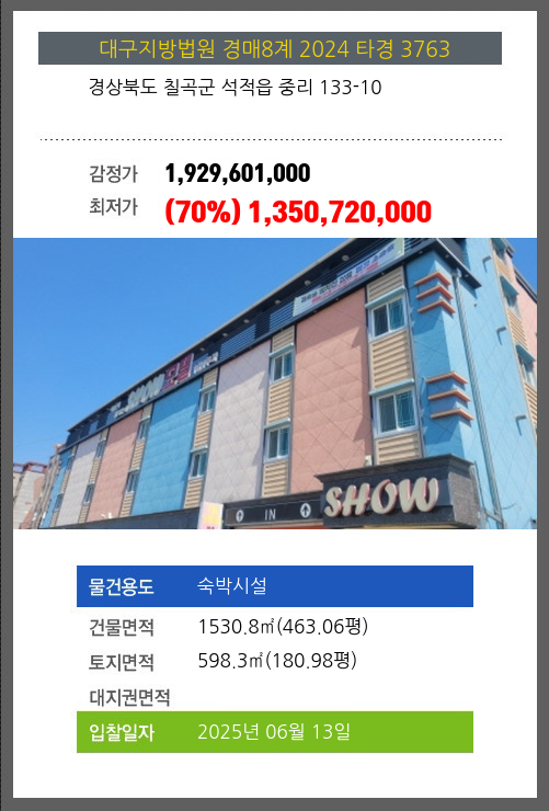 | 용도 | 숙박시설 | 채권자 | 에** | 감정가 | 1,929,601,000 |