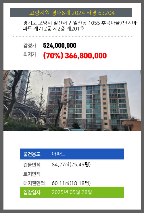 | 건물면적 | 84.27㎡ (25.49평) | 채무자 | ㈜** | 최저가 | (70%) 366,800,000 |