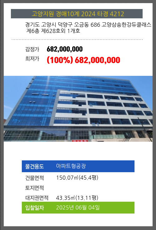 고양아파트형공장경매 고양시 덕양구 오금동 686 고양삼송한강듀클래스 제6층 제628호외 1개호 №2024 타경 4212
