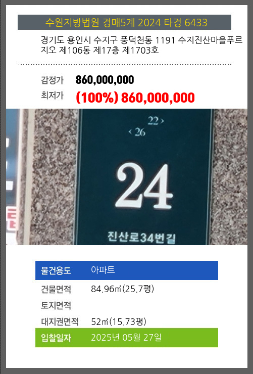 | 건물면적 | 84.96㎡ (25.7평) | 채무자 | 박** | 최저가 | (100%) 860,000,000 |