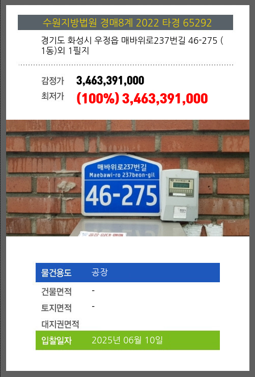 | 용도 | 공장 | 채권자 | 조** | 감정가 | 3,463,391,000 |