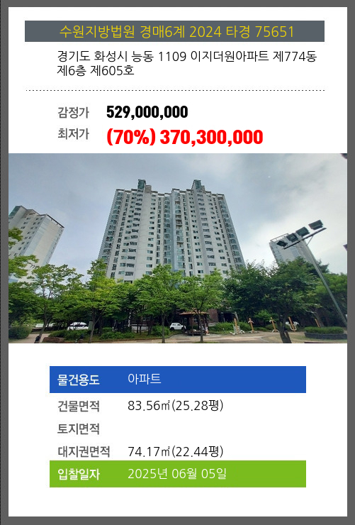 본건은 경기도 화성시 능동 1109 이지더원아파트 제774동 제6층 제605호