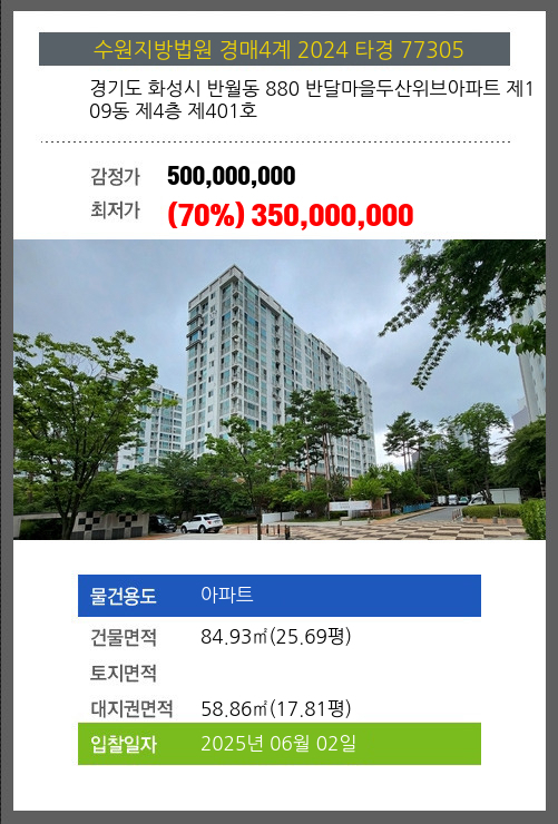 본건은 경기도 화성시 반월동 880 반달마을두산위브아파트 제109동 제4층 제401호
