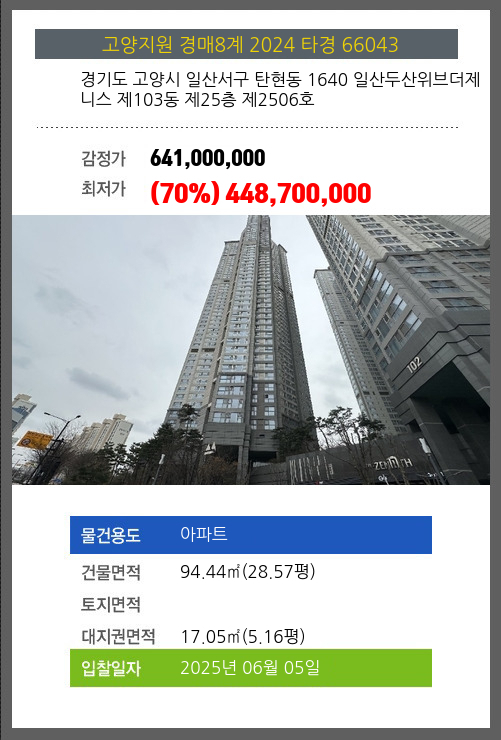 본건은 경기도 고양시 일산서구 탄현동 1640 일산두산위브더제니스 제103동 제25층 제2506호