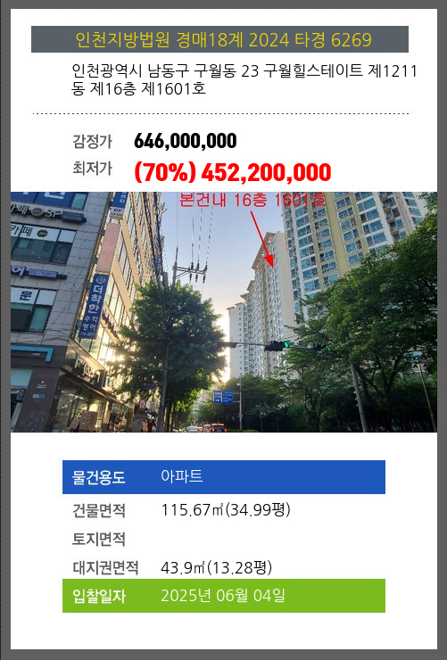 본건은 인천광역시 남동구 구월동 23 구월힐스테이트 제1211동 제16층 제1601호