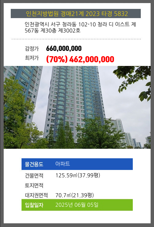 서아파트경매 서구 청라동 102-10 청라 디 이스트 제567동 제30층 제3002호 №2023 타경 5832