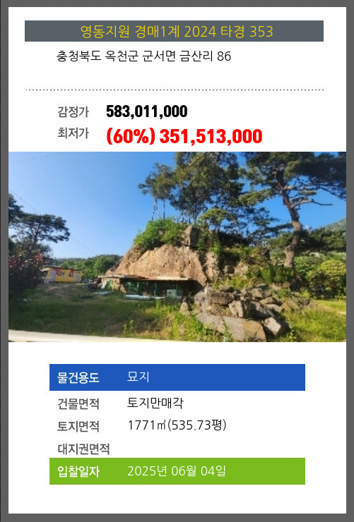 | 용도 | 묘지 | 채권자 | 옥** | 감정가 | 583,011,000 |