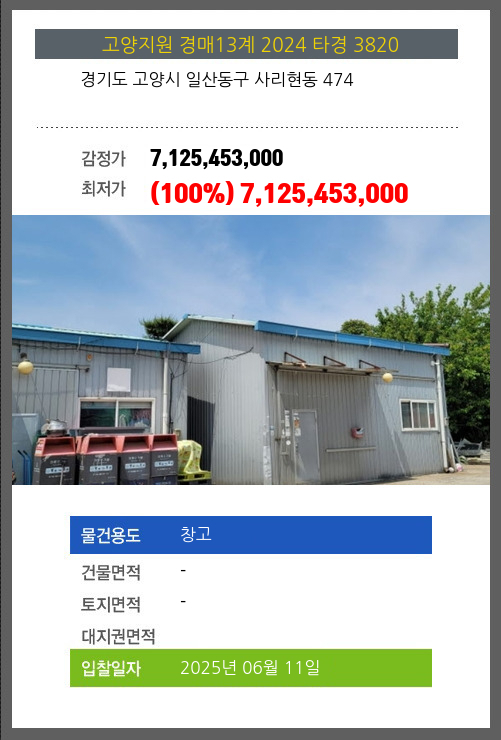 고양창고경매 고양시 일산동구 사리현동 474 №2024 타경 3820