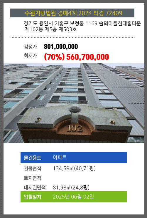 본건은 경기도 용인시 기흥구 보정동 1169 솔뫼마을현대홈타운 제102동 제5층 제503호