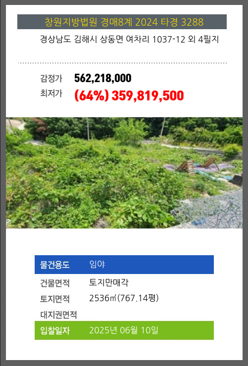 | 소재지 | [지번] 경상남도 김해시 상동면 여차리 1037-12 외 4필지 | ||||