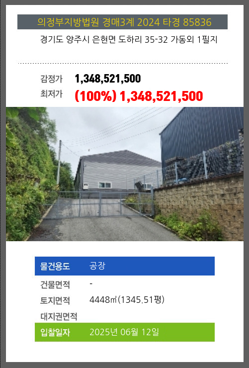 | 용도 | 공장 | 채권자 | 농** | 감정가 | 1,348,521,500 |