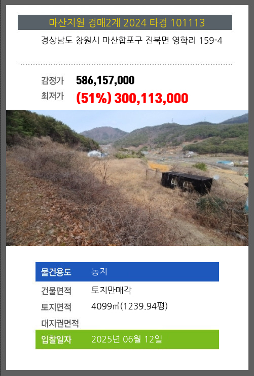 | 용도 | 농지 | 채권자 | 진** | 감정가 | 586,157,000 |