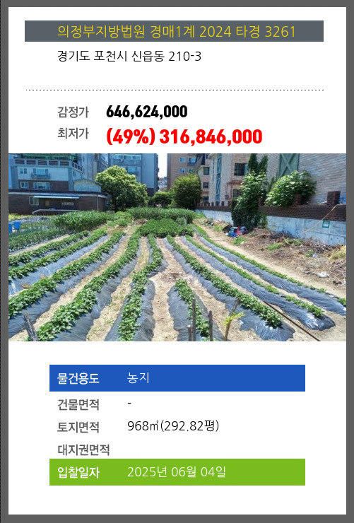 | 용도 | 농지 | 채권자 | 포** | 감정가 | 646,624,000 |