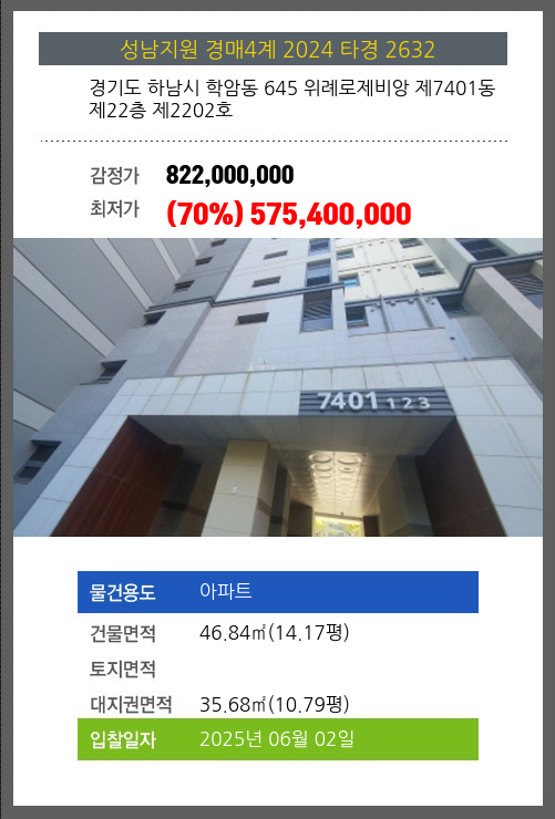 본건은 경기도 하남시 학암동 645 위례로제비앙 제7401동 제22층 제2202호