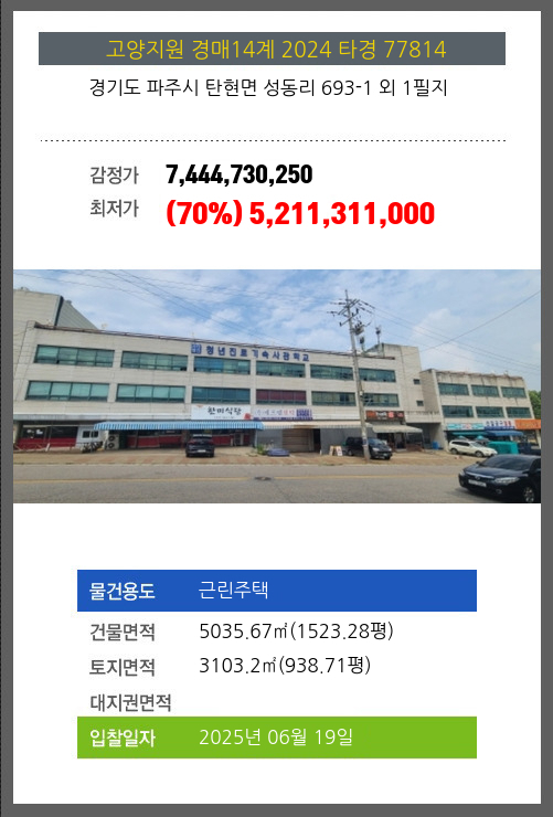 | 건물면적 | 5035.67㎡ (1523.28평) | 채무자 | 여** | 최저가 | (70%) 5,211,311,000 |