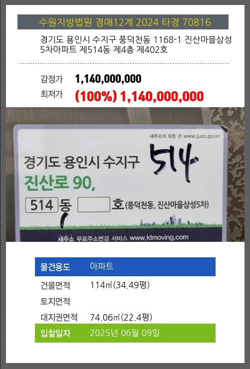 | 소재지 | [지번] 경기도 용인시 수지구 풍덕천동 1168-1 진산마을삼성5차아파트 제514동 제4층 제402호 [도로명 주소] 경기도 용인시 수지구 진산로 90 진산마을삼성5차아파트 제514동 제4층 제402호 |