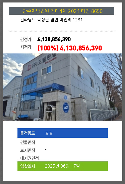 | 용도 | 공장 | 채권자 | 주** | 감정가 | 4,130,856,390 |
