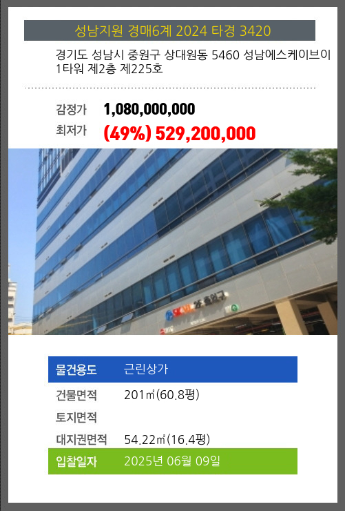 본건은 경기도 성남시 중원구 상대원동 5460 성남에스케이브이1타워 제2층 제225호