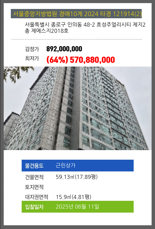 | 대지권 | 15.9㎡ (4.81평) | 소유자 | ㈜** | 보증금 | (10%) 57,088,000 |