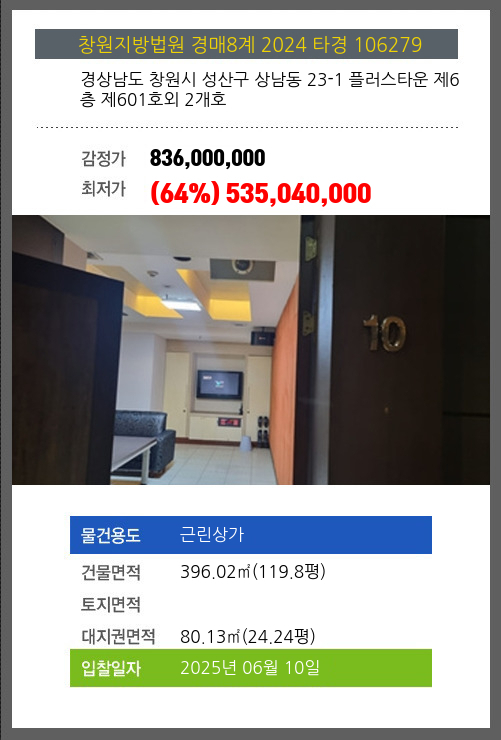 본건은 경상남도 창원시 성산구 상남동 23-1 플러스타운 제6층 제601호외 2개호