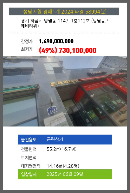하남상가경매 하남시 망월동 1147, 1층112호 망월동,트레비타워 №2024 타경 58994(2)