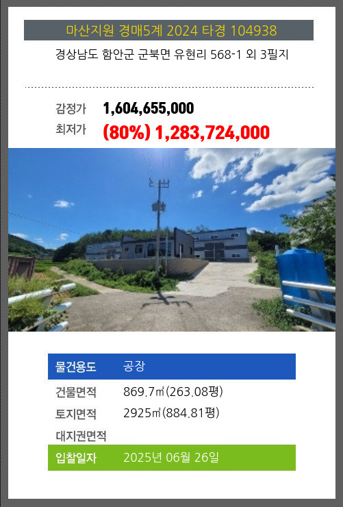 | 용도 | 공장 | 채권자 | ㈜**외1명 | 감정가 | 1,604,655,000 |