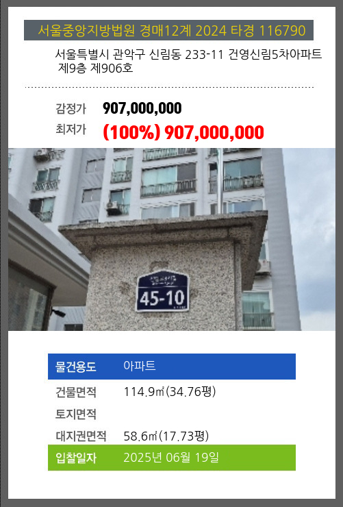 | 소재지 | [지번] 서울특별시 관악구 신림동 233-11 건영신림5차아파트 제9층 제906호 [도로명 주소] 서울특별시 관악구 신림로3가길 45-10 건영신림5차아파트 제9층 제906호 |
