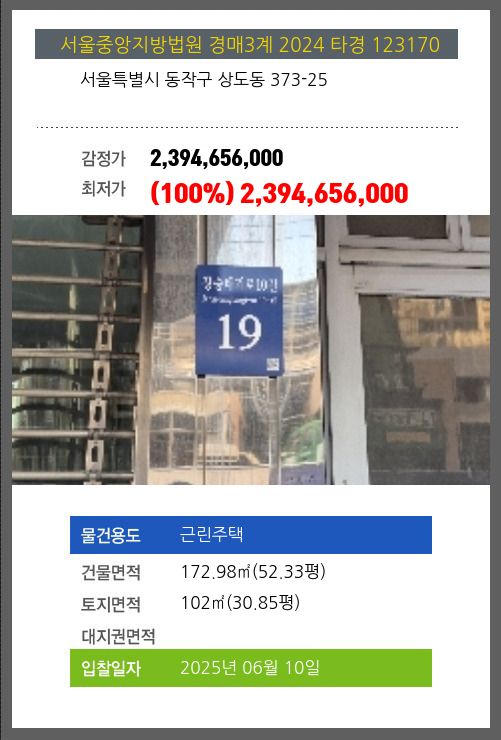 | 건물면적 | 172.98㎡ (52.33평) | 채무자 | 차** | 최저가 | (100%) 2,394,656,000 |