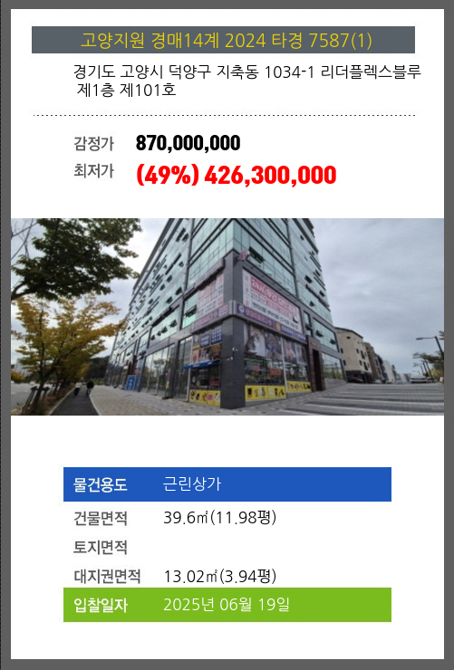본건은 경기도 고양시 덕양구 지축동 1034-1 리더플렉스블루 제1층 제101호