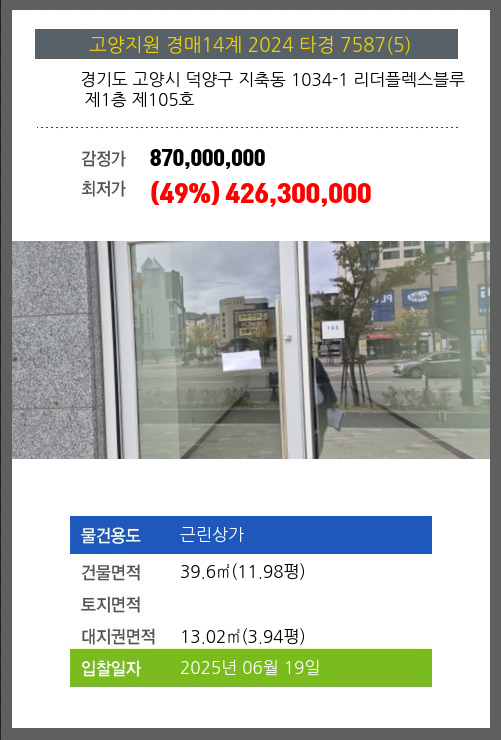 본건은 경기도 고양시 덕양구 지축동 1034-1 리더플렉스블루 제1층 제105호