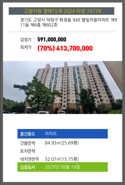 | 소재지 | [지번] 경기도 고양시 덕양구 화정동 948 별빛마을아파트 제911동 제6층 제602호 [도로명 주소] 경기도 고양시 덕양구 화신로 311 별빛마을아파트 제911동 제6층 제602호 |
