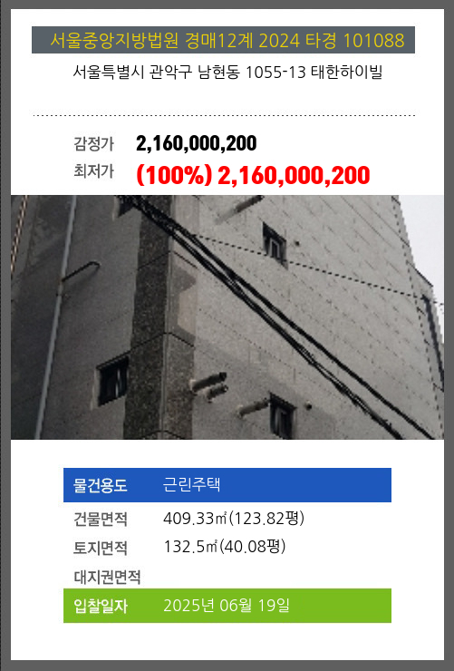 | 용도 | 근린주택 | 채권자 | 이**외1명 | 감정가 | 2,160,000,200 |