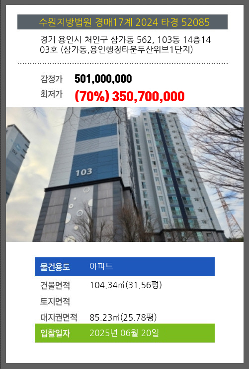 용인아파트경매 용인시 처인구 삼가동 562, 103동 14층1403호 삼가동,용인행정타운두산위브1단지 №2024 타경 52085