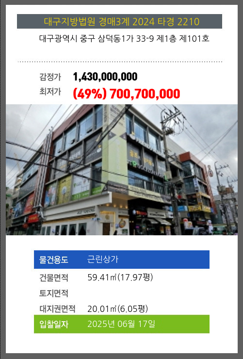 | 용도 | 근린상가 | 채권자 | 대**외1명 | 감정가 | 1,430,000,000 |