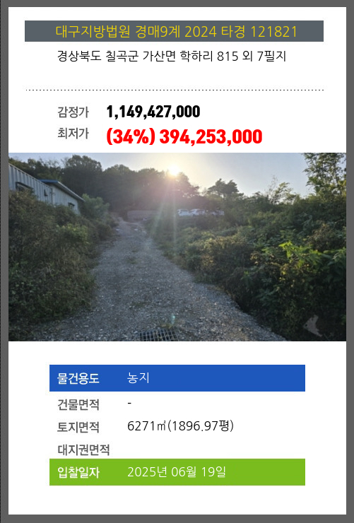 | 용도 | 농지 | 채권자 | 칠** | 감정가 | 1,149,427,000 |