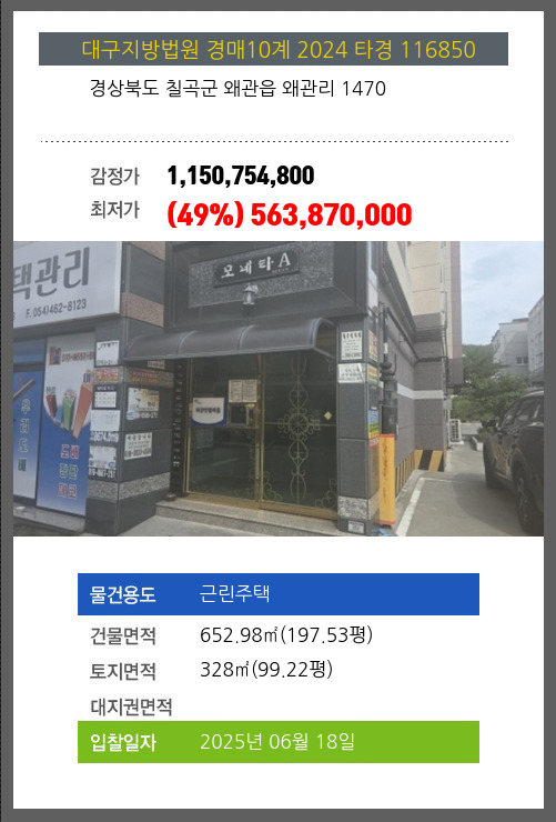 | 용도 | 근린주택 | 채권자 | 왜** | 감정가 | 1,150,754,800 |