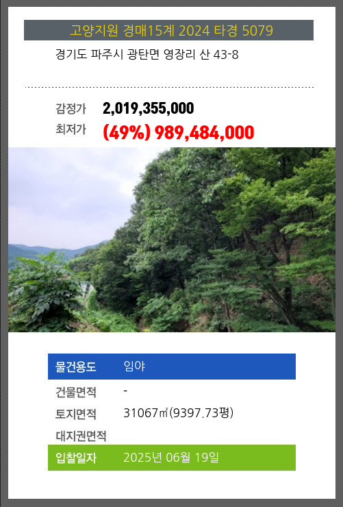 | 용도 | 임야 | 채권자 | 이** | 감정가 | 2,019,355,000 |