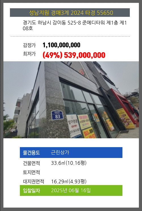 하남상가경매 하남시 감이동 525-8 준메디타워 제1층 제108호 №2024 타경 55650
